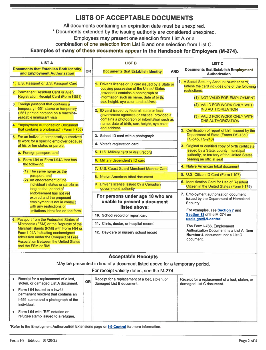 Due to this change, I need to have all current employees come to security with proof of valid driver’s license, and a document from List A, or documents from List B and List C. Please have all employees complete this by November 14, 2025. Should anyone not come in, their access cards will be shut off until they comply. New applicants will need both types of documents.